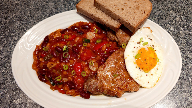 Lehce pikantní směs fazolí a zeleniny, dochucená rajčatovým protlakem, kečupem a sladkou chilli omáčkou, přináší bohatou chuť i příjemnou sytost. Skvěle ji doplní volská oka podávaná spolu se šťavnatými plátky krkovice.