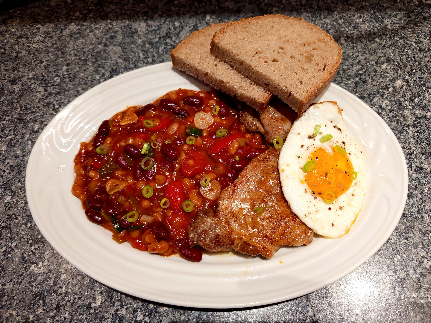 Krok 11: Fazolovou směs podáváme s chlebem, steakem z krkovice a volským okem.