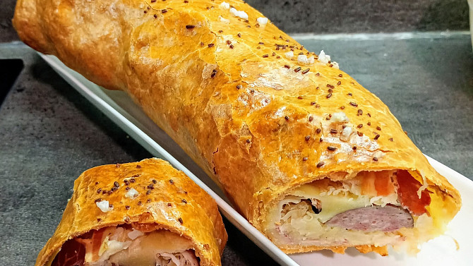 Z listového těsta během chvilky vykouzlíte chutné občerstvení. Slaný štrúdl se slaninou, kysaným zelím, klobásou a strouhaným sýrem je ideální jako pohoštění pro návštěvu, vydatná svačina i jednoduchá večeře.