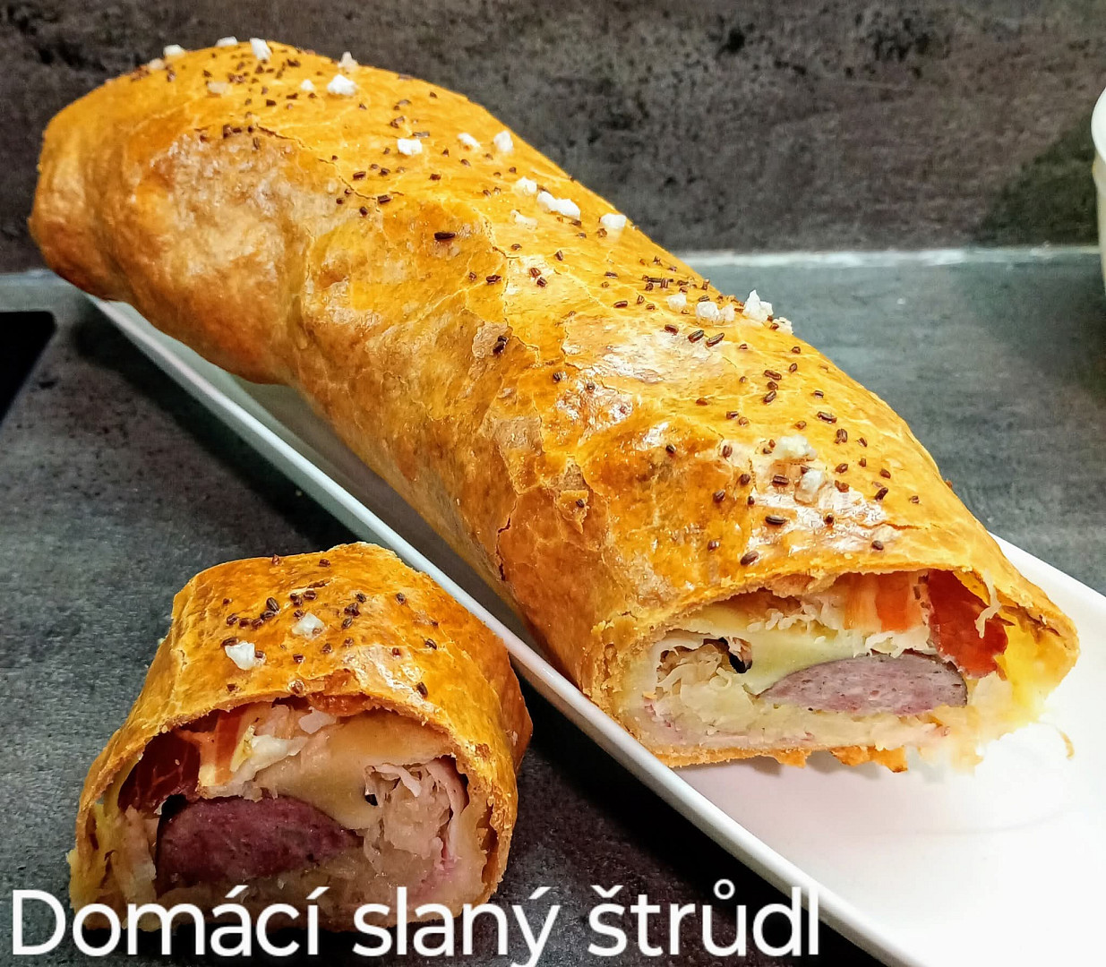 Slaný štrůdl se zelím, slaninou, sýrem a klobásou