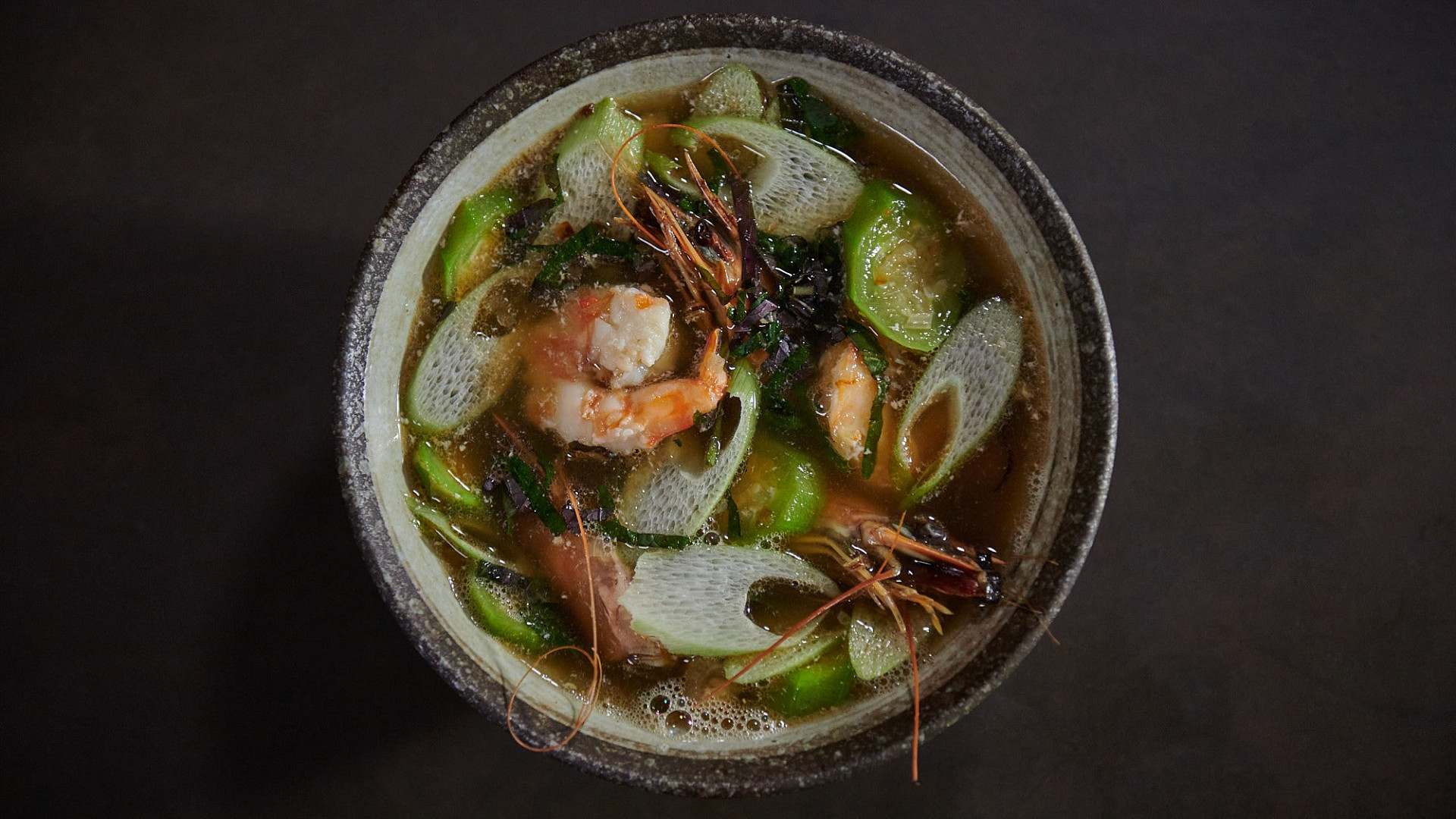 Oku lahodící barevná polévka je uvařená ze silného, dlouho taženého masového vývaru, zeleniny a krevet. Překvapí vás skvělou chutí i množstvím netradičních surovin. V misce pak porce ozdobíme plátky taro stonků, perilou a celými krevetami.