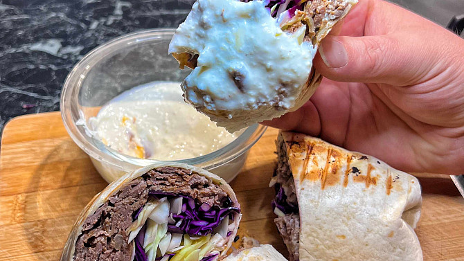 Krok 10: Na tortillu rozetřeme dresink dle chuti. Přidáme maso, nakrájené zelí, pevně zabalíme a na rozpálené grilovací pánvi opečeme z obou stran dozlatova.