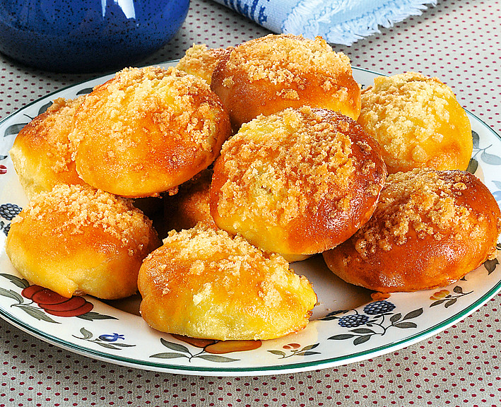 Krok 6: Koláčky rovnáme na připravené plechy, potřeme je rozšlehaným vejcem a posypeme drobenkou.
