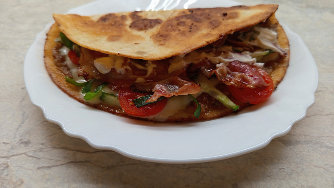 Krok 5: Jakmile je maso opečené, otočíme celou tortillu pomocí obracečky, aby se opékala tortilla. Na polovinu poklademe sýr, rajčata, cibulku, okurky, slaninu a necháme asi 1 minutku opéct a prohřát.