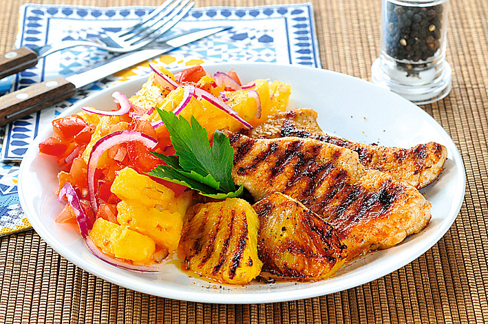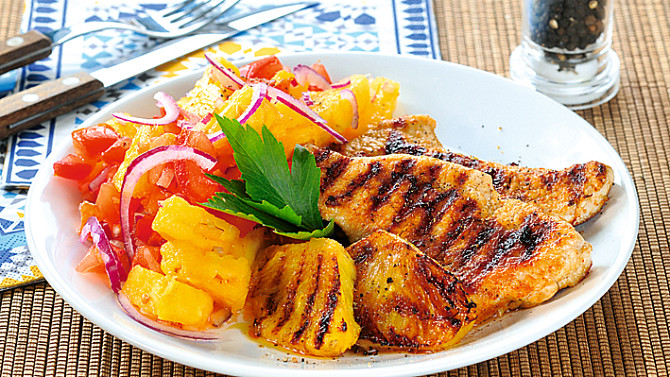 Hledáte pokrm, který přinese skutečnou explozi chutí? Krůtí plátek se salátem z ananasu, červené cibule, rajčat a chilli papričky je přesně takový. Maso stačí naložit do marinády, opéct na grilu nebo grilovací pánvi dozlatova a rovnou podávat.