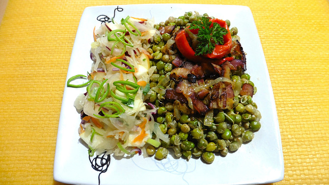 hrách, slanina anglická, cibule, sádlo, sůl, pepř mletý, zelí kysané, jablko, jablko, mrkev, cibule červená, cibulka jarní, olej olivový, sůl, pepř mletý, cukr krupice