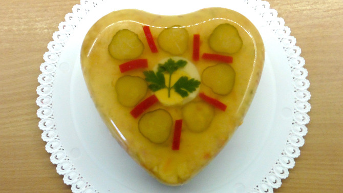 Krok 1: Želatinu zamícháme do studeného vývaru, necháme 10 minut stát. Poté zahřejeme do rozpuštění želatiny. Tekutina ale nesmí vařit. Krok 2: Do formy ve tvaru srdíčka nalijeme část želatiny, aby vytvořila asi 5 mm vysokou vrstvu. Tu dáme ztuhnout do lednice. Zbytek želatiny udržujeme tekutou ve vodní lázni. Krok 3: Mezitím nakrájíme okurku na kolečka, scedíme a nakrájíme nakládanou kapii a vejce nařežeme na plátky. Krok 4: Poté na první vychladlou vrstvu narovnáme ozdobně plátky okurky, proužky papriky, plátky vejce, snítku petrželky. Zalijeme malou vrstvou želatiny a opět dáme zcela ztuhnout. Krok 5: Mrkev očistíme a nastrouháme nahrubo. Cibuli oloupeme a nakrájíme nadrobno. Šunku nakrájíme na drobné nudličky. Okurku nastrouháme nahrubo. Zbylá vejce nakrájíme nadrobno. Krok 6: Nastrouhanou mrkev a nakrájenou cibuli povaříme 7 minut v osolené vodě a scedíme. Krok 7: Do mísy dáme tvaroh, majonézu, chladnou a okapanou zeleninu, nakrájenou šunku a papriku, nastrouhanou okurku a vařená vejce. K připraveným surovinám v míse přidáme téměř chladnou želatinu (pokud nám již ztuhla, lehce ji přihřejeme), zamícháme a podle chuti osolíme, opepříme a dochutíme octem a cukrem. Krok 8: Ihned nalijeme na ztuhlý základ ve formě. Vše necháme ztuhnout v lednici a následně opatrně vyklopíme.