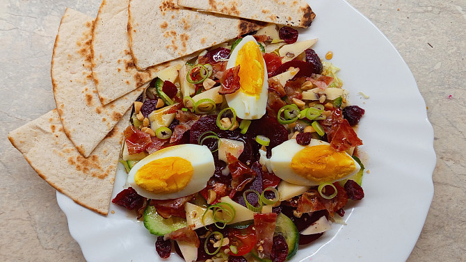 Sladkokyselý salát z červené řepy se slaninou, vejci a ořechy