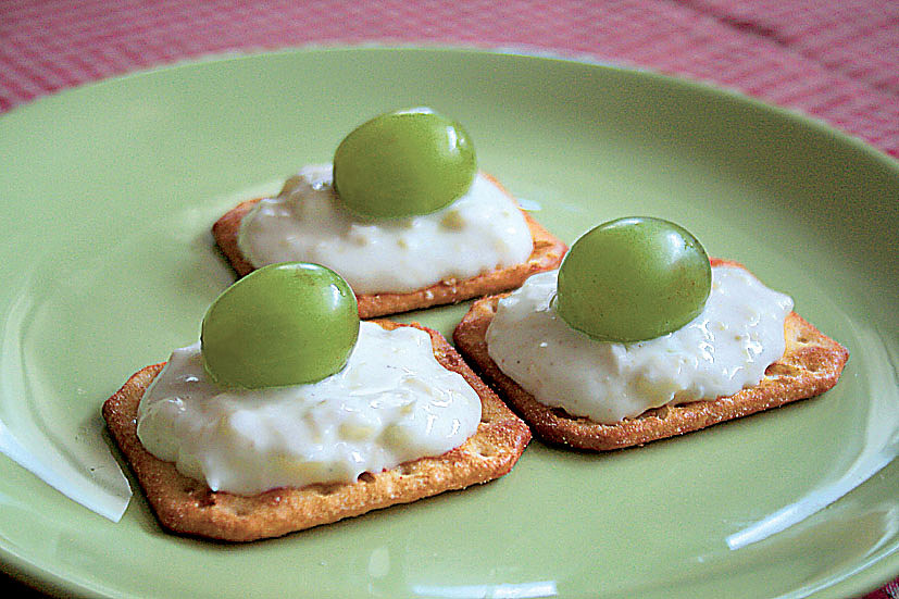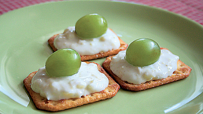 Máte rádi občerstvení, které je hotové za pár minut a vy se tak můžete věnovat návštěvě? Stačí mít po ruce slané krekry, potřít je sýrovou pomazánkou a ozdobit kuličkami hroznového vína. Dokonalé slané pohoštění je rázem na stole.