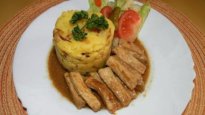 Jednoduše zpracované vepřové maso. Nudličky z vepřové kotlety nejprve naložíme s cibulí do oleje a ochucovadel, a poté je orestujeme. Z výpeku pak připravíme omáčku zjemněnou máslem. Masové nudličky podáváme třeba se šťouchaným bramborem.