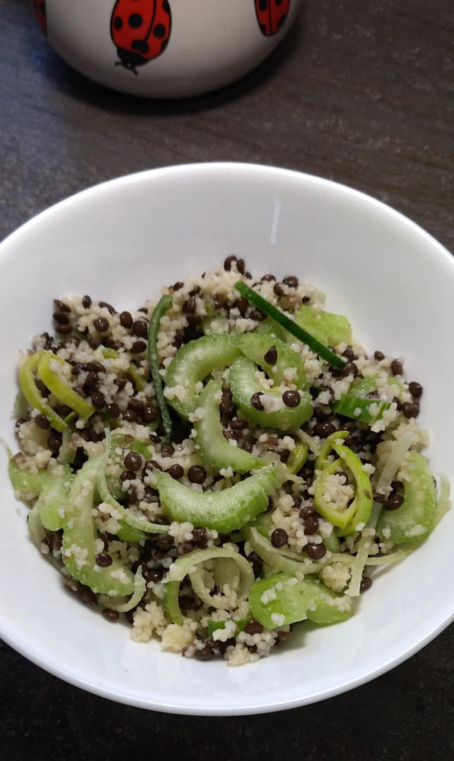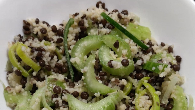 Krok 5: Zmiešame kuskus a šošovicu s horčicovou marinádou, pridáme celer a pór, premiešame a necháme odstáť v chlade.