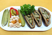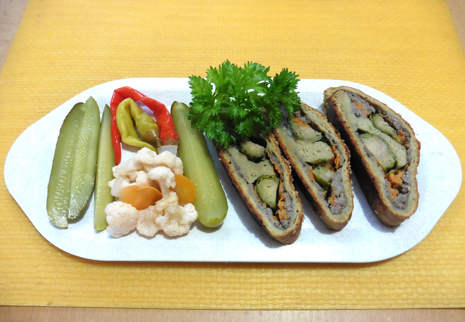 Závin z bramborového těsta plněný prejtem a růžičkovou kapustou