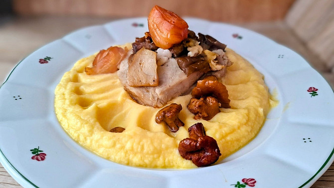 Vepřová pečeně, květátovo mrkvové pyré a restované houby na másle