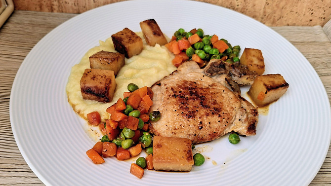 Šťavnatá kotleta s lahodným kedlubnovým pyré s dušenou zeleninou je pokrm, který ocení lidé s dietou či diabetem. Stačí jen z uvařených kedluben udělat pyré a kotletu pár minut opéct na pánvi. Vše doplníme zeleninou podušenou ve výpeku z masa.