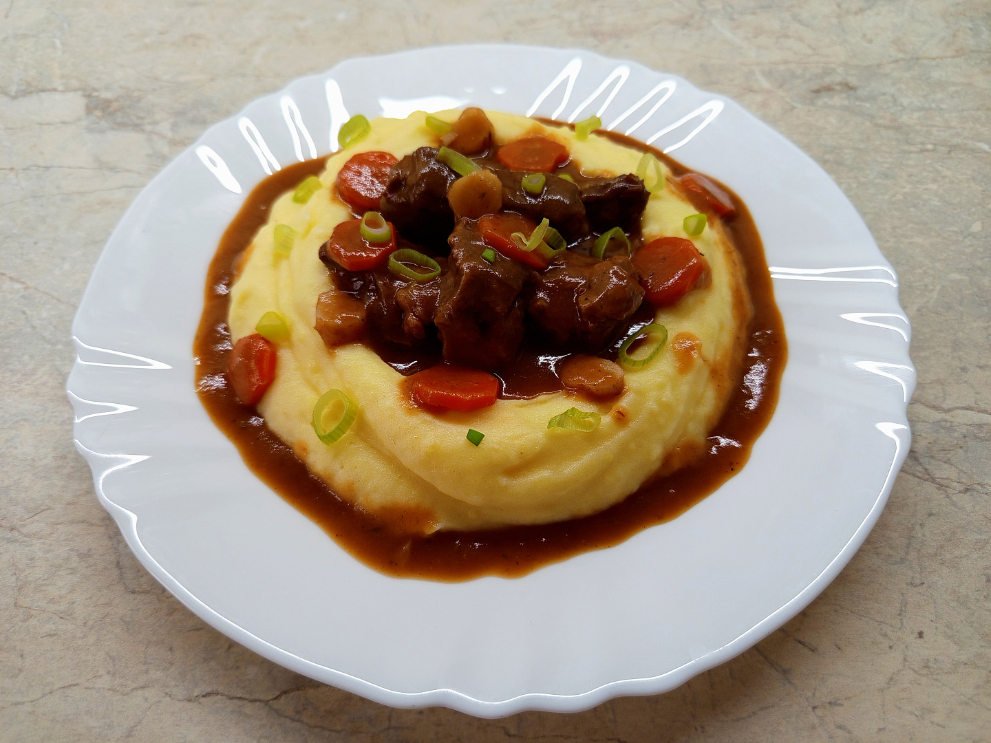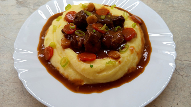 Hovězí kližka dušená v červeném víně s bohatou omáčkou z kořenové zeleniny se bude rozplývat na jazyku. Jako příloha je ideální hladká bramborová kaše, ale můžeme zvolit také bramborový knedlík nebo dušenou rýži.