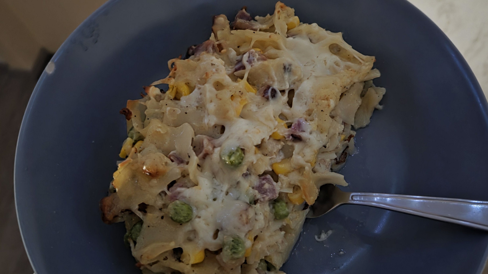 Krok 4: Do hotového základu přidáme těstoviny, hrášek, kukuřici i část nastrouhaných sýrů (zbytek necháme na posypání) a vše promícháme. Směs necháme krátce zchladnout, aby se při přidání vejce nesrazila.