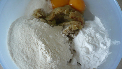 Krok 3: Do vlažné kaše přidáme mléko, mouku s kypřicím práškem, cukr, olej, 2 vejce, 2 žloutky, rum a promícháme.