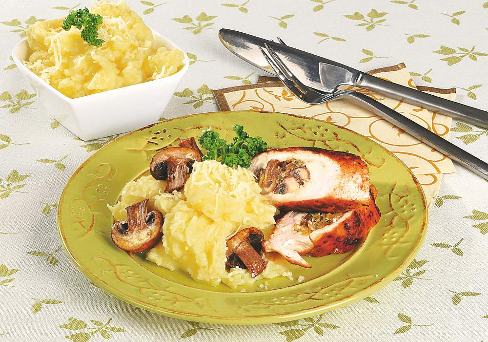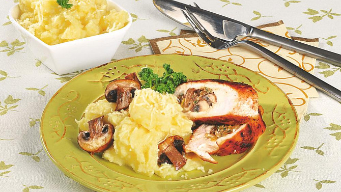 Nadívaná kuřecí prsíčka jsou skutečně svátečním jídlem. Po rozkrojení se odhalí krásná mozaika z orestovaných žampionů, cibulky a vajec. Celý pokrm doplňuje hedvábně jemná bramborová kaše, ozvláštněná strouhaným sýrem.