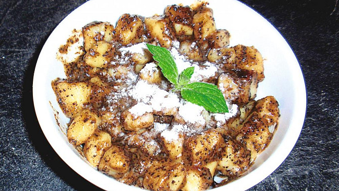 Krok 5: Uvařené šúlance polijeme rozpuštěným máslem, posypeme mletým mákem a polijeme povidlovou omáčkou.