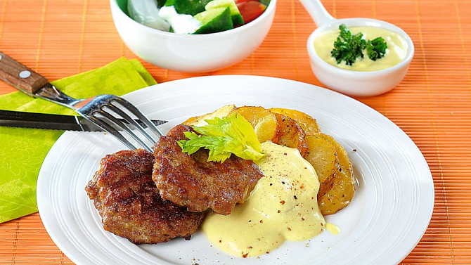 Krok 7: Hotové biftečky podáváme s pečenými bramborami a dijonskou omáčkou. Můžeme doplnit zeleninovým salátem.