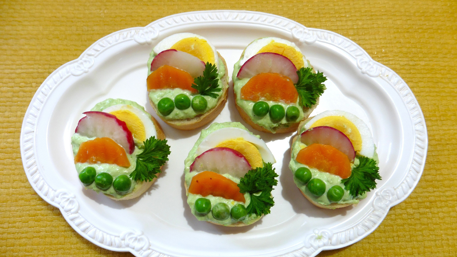 Jednohubky s hráškovou pomazánkou a vařeným vejcem