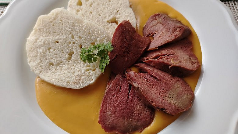 Uzený vepřový jazyk se zeleninovou omáčkou se smetanou