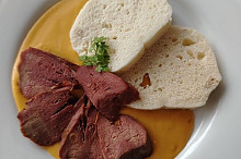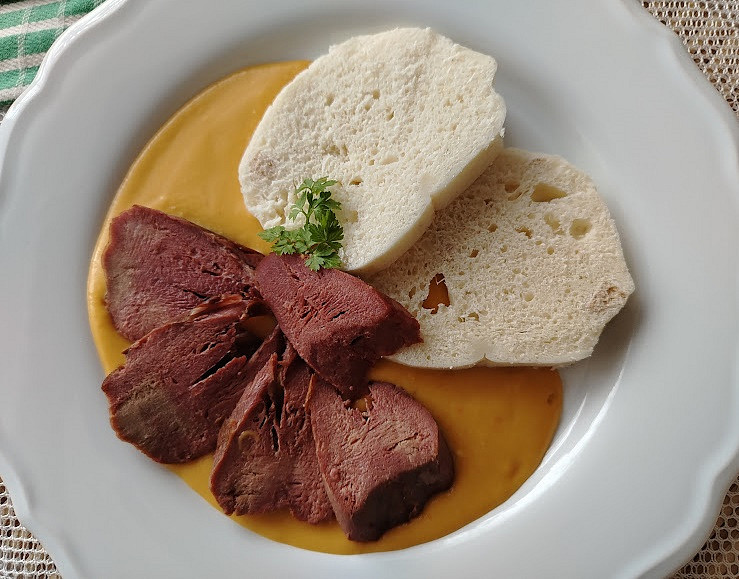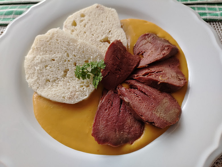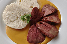 Uzený vepřový jazyk se zeleninovou omáčkou se smetanou