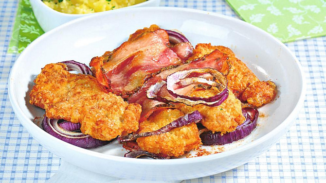 Krok 5: Obalené řízky krátce osmažíme na pánvi z obou stran do zezlátnutí. Poté řízky vyjmeme a dáme do pekáčku na cibuli. Proložíme plátkovou slaninou.