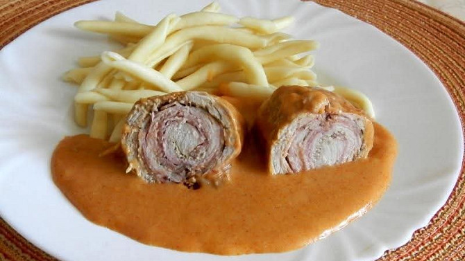 Krok 6: Kuřecí roládky podáváme se smetanovou omáčkou a přílohou dle chuti.