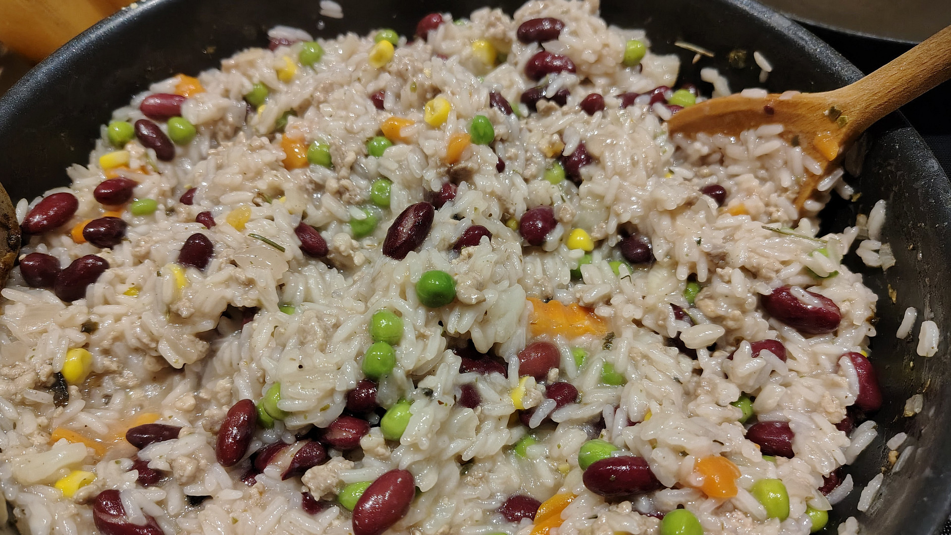 Krok 4: Přidáme suchou rýži, koření a prolisovaný česnek. Za občasného míchání dusíme do změknutí rýže (asi 15 minut, dle návodu na obalu). Dle potřeby můžeme dolít vodu (nebo vývar).