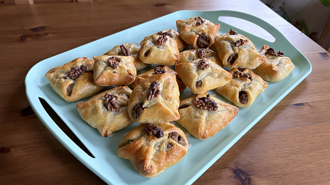 Šátečky z křehkého tvarohového těsta s ořechovo-jablečnou náplní jsou upečené dozlatova a zdobené půlkou vlašského ořechu. Drobné pečivo, které padne tak akorát do ruky, je skvělou sladkou tečkou k odpolední kávě.