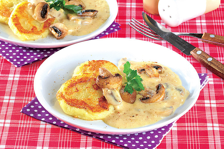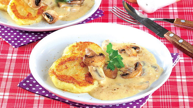 Škubánkové placky se žampionovou omáčkou