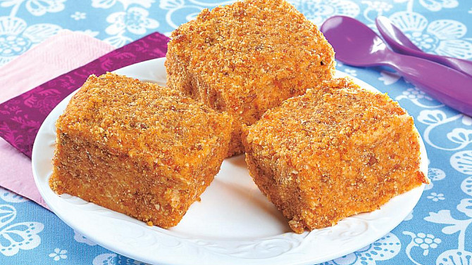 Griliášové kostky jsou sladkou tečkou, která potěší milovníky ořechových dezertů. Nadýchaný piškotový korpus s vůní vanilky a citronu je promazaný jemným karamelovým krémem a celý obalený v křupavém griliáši z vlašských ořechů.