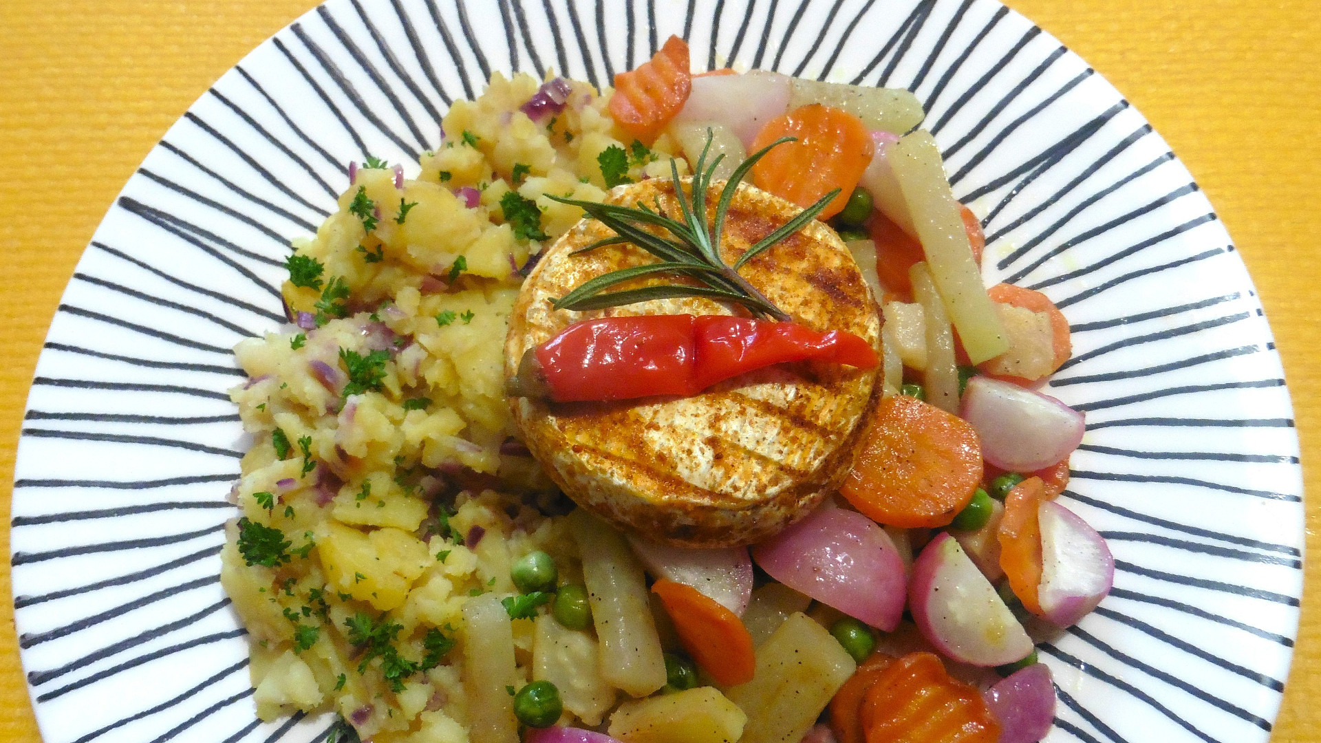 Camembert z horkovzdušné fritézy s dušenou zeleninou