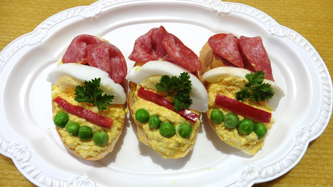 Jarní mini chlebíčky se hodí na každou oslavu nebo jako občerstvení pro návštěvu. Zešikma nakrájené rohlíky doplněné o vaječnou pomazánku odlehčenou tvarohem zdobíme plátky salámu, kouskem vajíčka, nakládanou paprikou a hráškem. Krásně nazdobené zaujmou na první pohled.