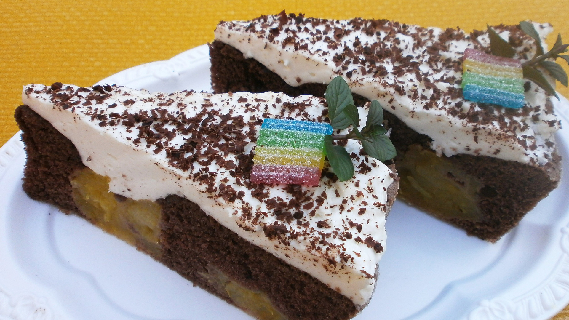 Koláč, který bude krásně vláčný a šťavnatý díky broskvovému pudinku, zaujme propojením chutí. Chuť broskví doplní lehce kakaová chuť korpusu koláče, ale také jemný krém ze zakysané smetany, kterým je koláč potřen na svém povrchu. Ozdobený barevným želé a mátou zachutná všem.