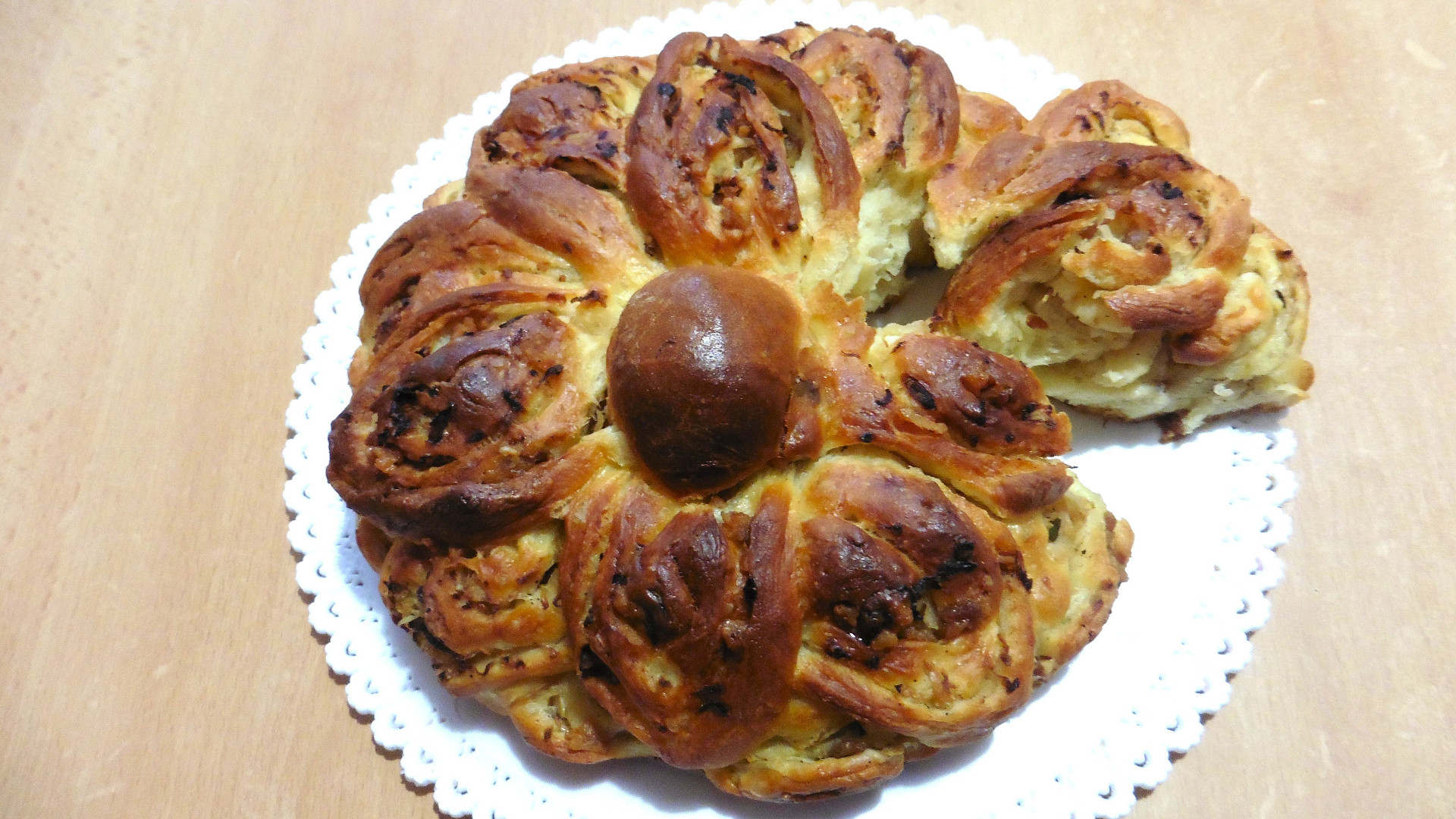 Kynutému těstu plněnému kysaným zelím a škvarky můžeme dát i netradiční podobu. Když si z těsta připravíme naplněnou roládu, stačí už jen nakrájet na kolečka a ty pak pěkně vyskládat do remosky. Výsledkem bude lahodný květ z kynutého těsta.
