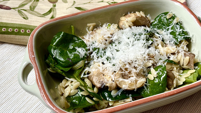 Krémové těstoviny orzo se žampiony a baby špenátem připravíte na jedné pánvi během chvilky. Jednoduchý bezmasý oběd nebo lehká večeře doplněná máslem a parmezánem potěší milovníky rychlé italské kuchyně.