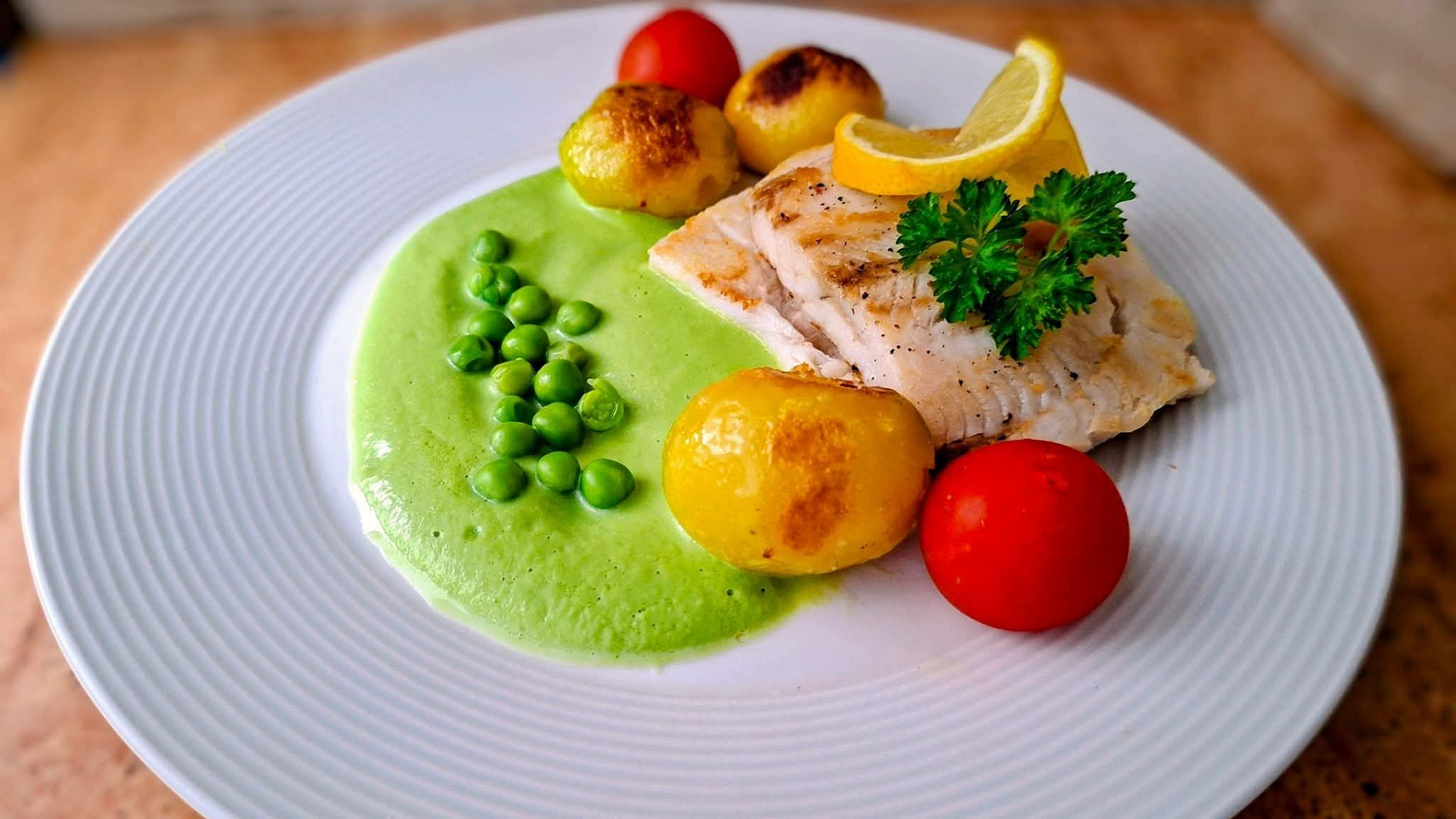Jídlo, které na první pohled zaujme svou čistou, svěží prezentací a stejně příjemně překvapí i vyváženou chutí. Kombinace křehkého tresčího filé, jemného hráškového pyré a dozlatova opečených brambor tvoří lehký a zdravý pokrm.