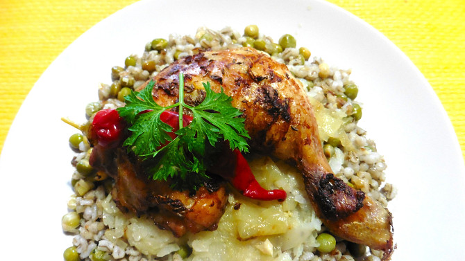 Šoulet s pečeným kuřecím stehnem na zelí je poctivé a syté jídlo inspirované tradiční kuchyní. Hrách s kroupami, česnekem a majoránkou tvoří vydatný základ, který doplní šťavnaté kuřecí maso a kysané zelí.