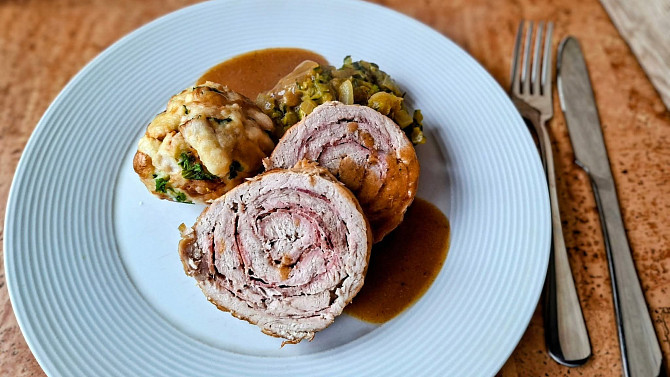 Vepřová roláda, cuketové zelí a karlovarský knedlík