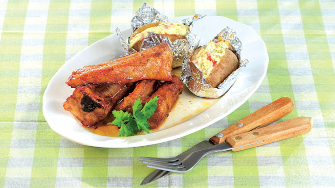 Medová žebírka marinovaná v sójové omáčce, medu a sladké paprice se při pomalém pečení krásně rozvoní a získají zlatavou, lehce karamelovou kůrku. Podávaná s bramborami plněnými bylinkovým tvarohem tvoří dokonalý oběd.