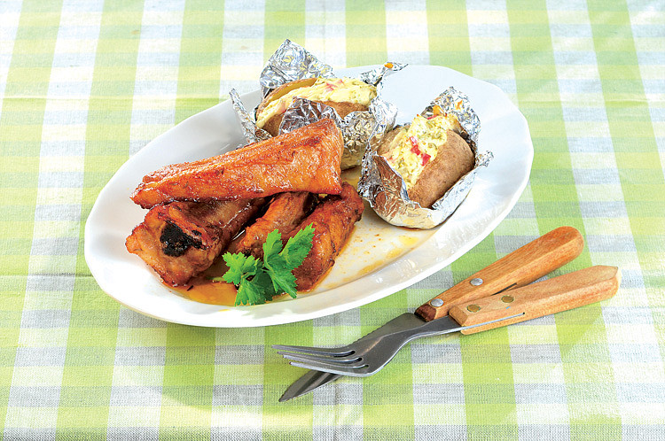 Medová žebírka a pečené brambory s bylinkovým tvarohem