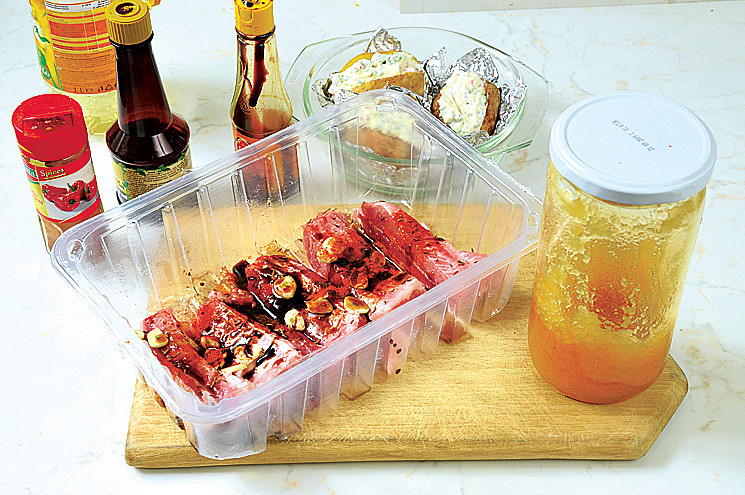 Medová žebírka a pečené brambory s bylinkovým tvarohem