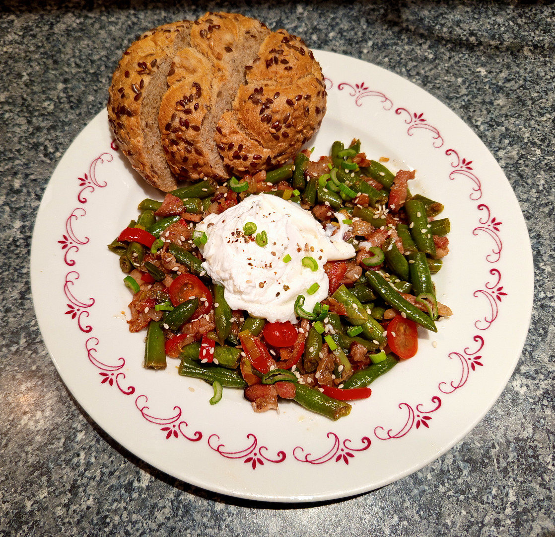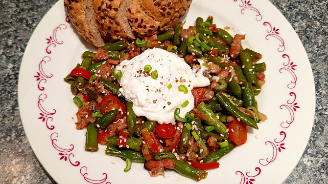 Salát nemusí znamenat jen hromadu zelených listů se zeleninou. Nejen v chladných dnech uvítáme teplou variantu salátu. Tu můžeme připravit ze zelených fazolek, rajčat a papriky. Dokonale je doplní vejce a slanina.