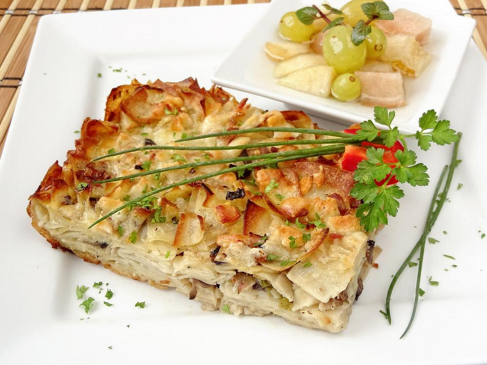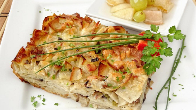Hledáte tip na poctivý rodinný oběd? Zapečené flíčky se žampiony, slaninou a pórkem jsou sázkou na jistotu. Stačí je zalít vaječnou směsí, upéct dozlatova a podávat s čerstvou petrželkou a oblíbeným kompotem.