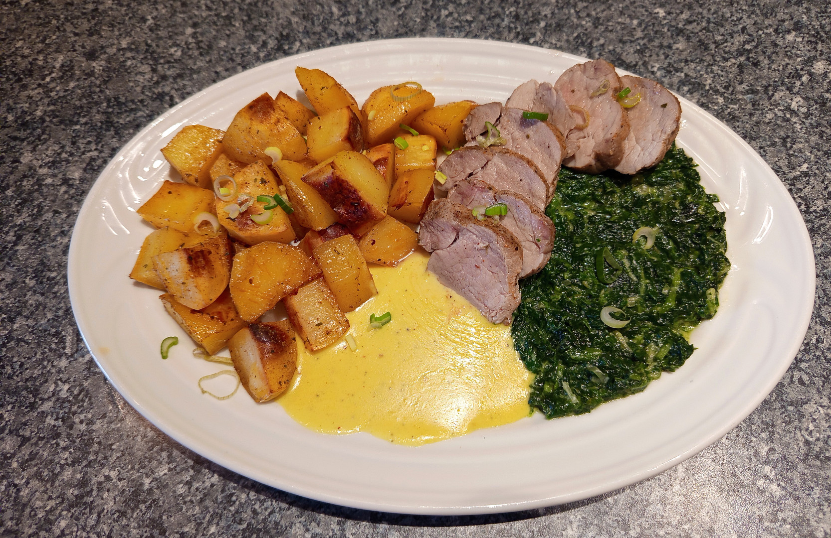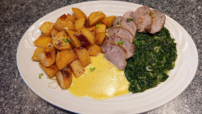 Tento pokrm působí slavnostně a elegantně, jeho příprava je však překvapivě jednoduchá. Panenka se zatáhne na pánvi a dopeče v troubě. Z výpeku se připraví sýrová omáčka z nivy a čedaru. Vše doplní krémový špenát s cibulkou a česnekem.