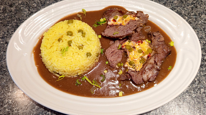 Poctivá nedělní pečeně z hovězího masa v omáčce z výpeku je chutným jídlem pro celou rodinu. Hovězí maso je plněné směsí vajec a hrášku. Po upečení ho nakrájejte na plátky a získáte nádhernou mozaiku. Nejlépe chutná s knedlíkem či rýží.