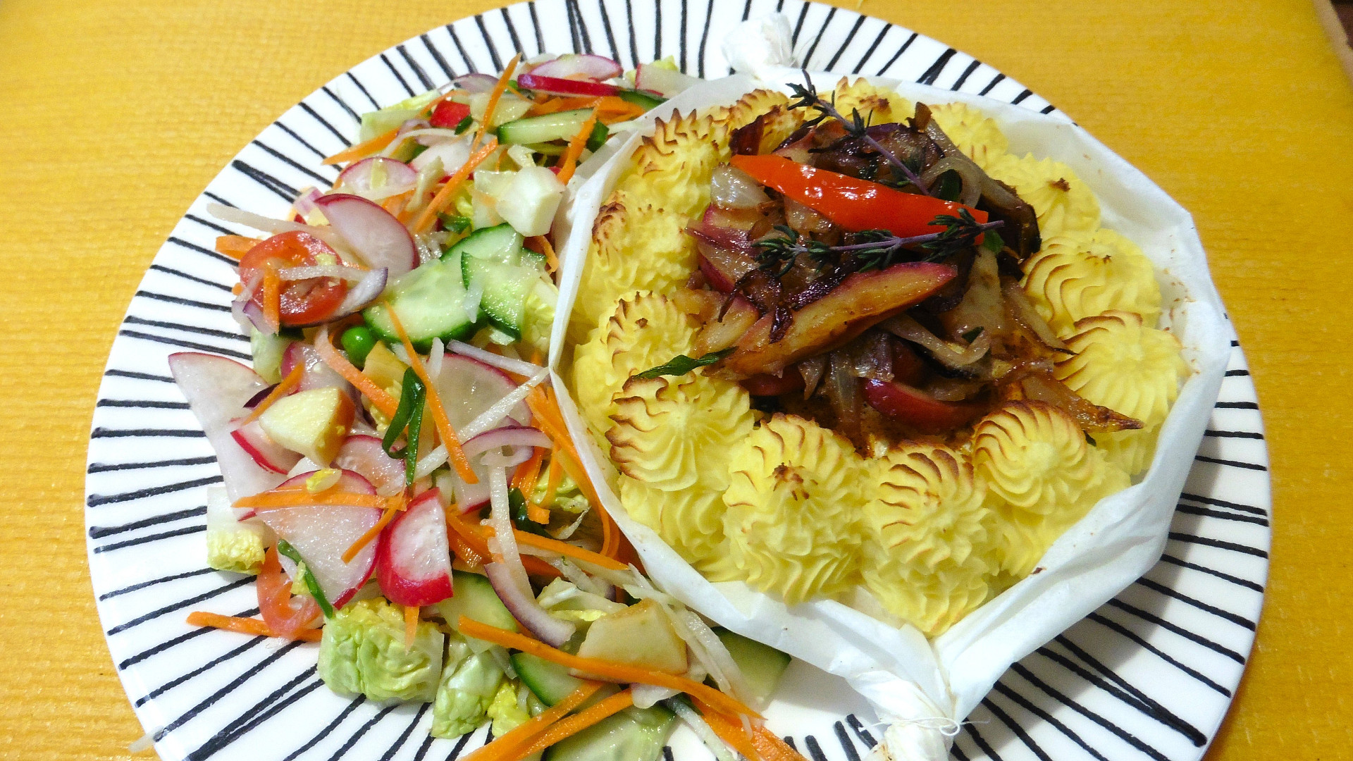 Zapečený hermelín v bramborové kaši s opečenou cibulkou s jablíčkem