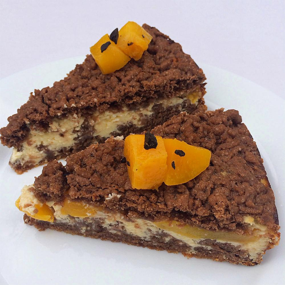 Strouhaná buchta s kompotovanými broskvemi